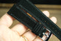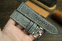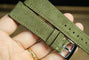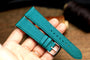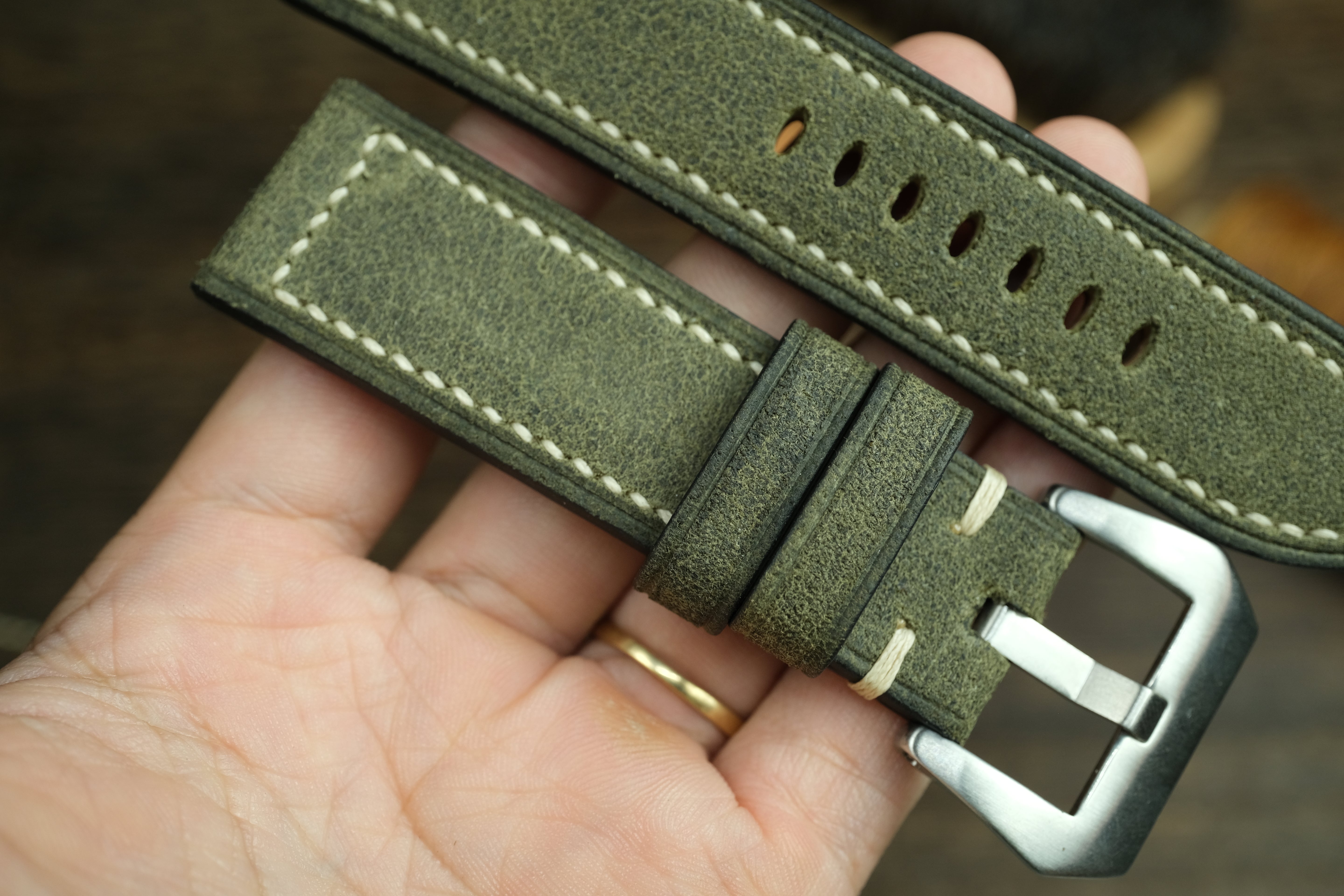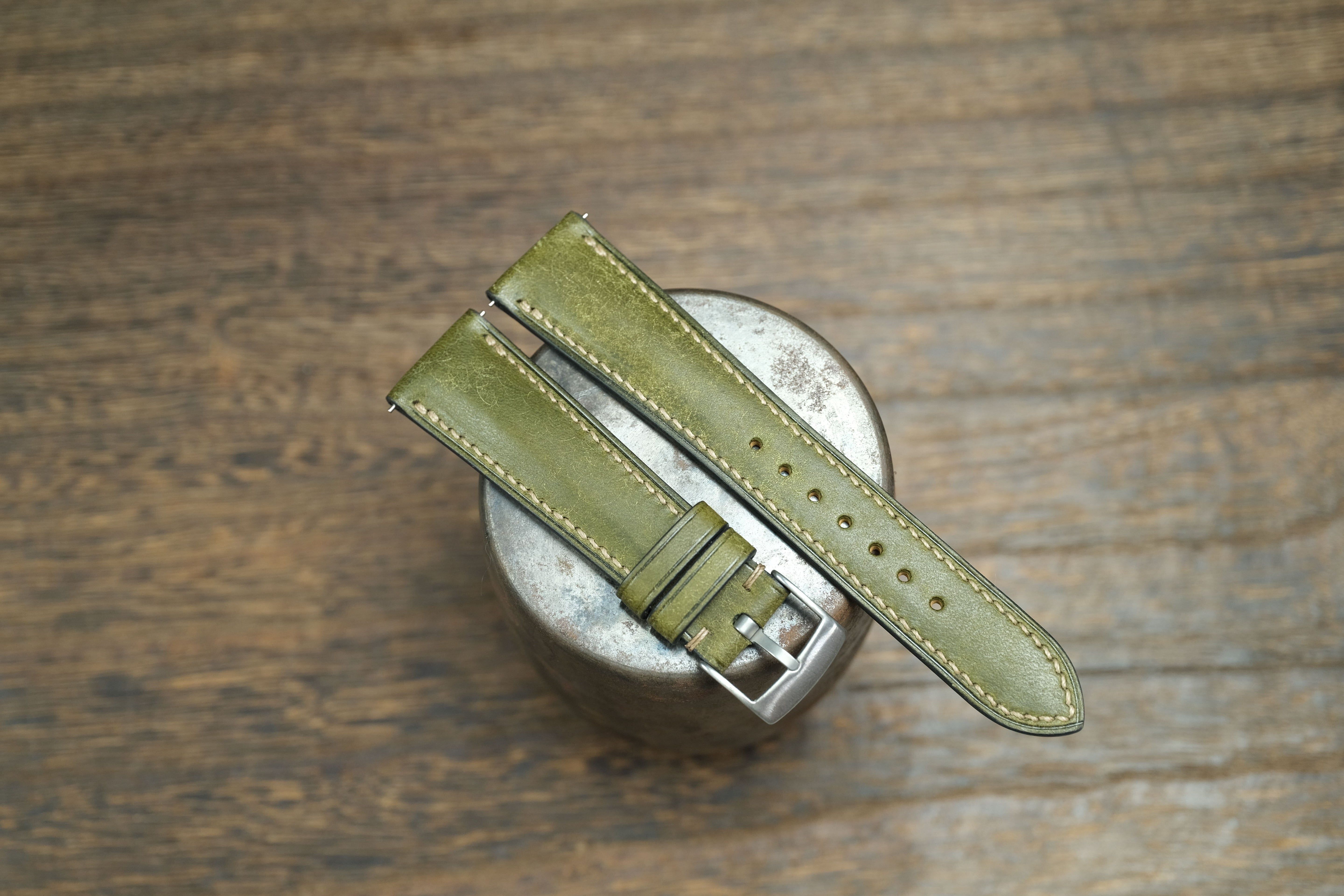 A glossy green leather strap with visible texture and cream stitching for a refined, vintage look.