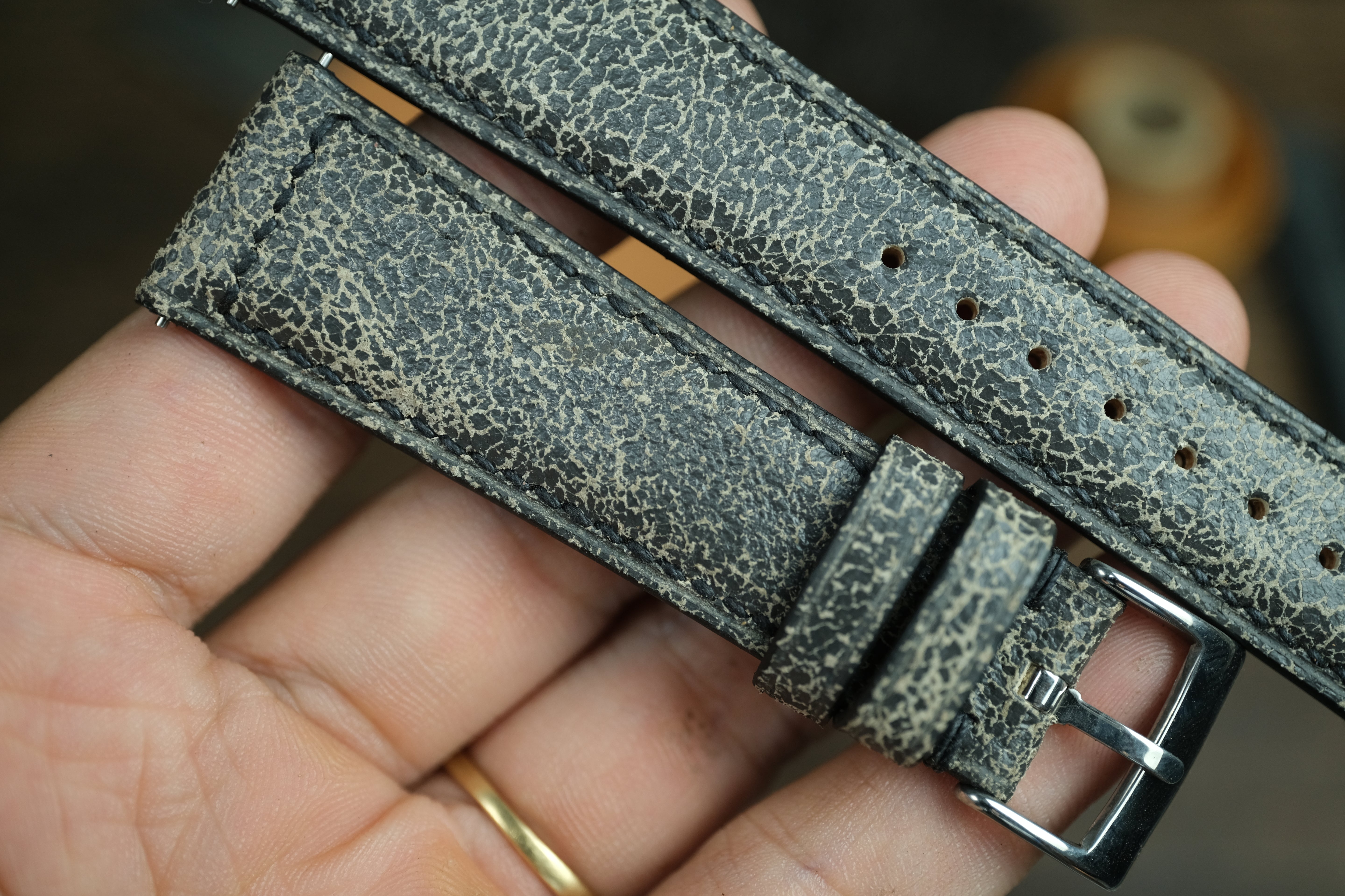 Distressed leather represents authentic vintage craftsmanship, featuring intentionally aged textures and color variations that create instant character. This handmade black/grey distressed watch strap showcases carefully controlled distressing processes that achieve natural weathered appearance without compromising durability. The unique black/grey color combination provides versatile styling options, making this Vietnamese leather watch strap ideal for both casual and semi-formal occasions.